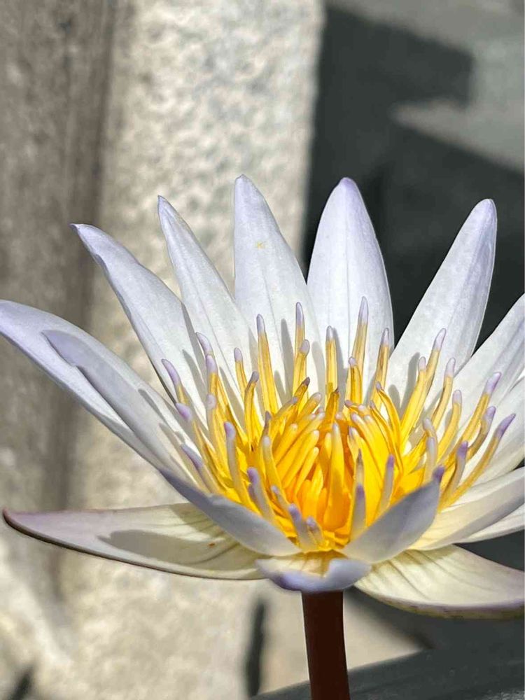 睡蓮鉢からぽっかりと咲く清楚なお花は石屋さんの前で。