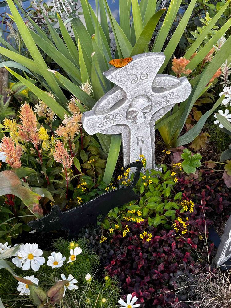 ドクロマークのクロスの飾りにツマグロヒョウモン🦋が止まっていました