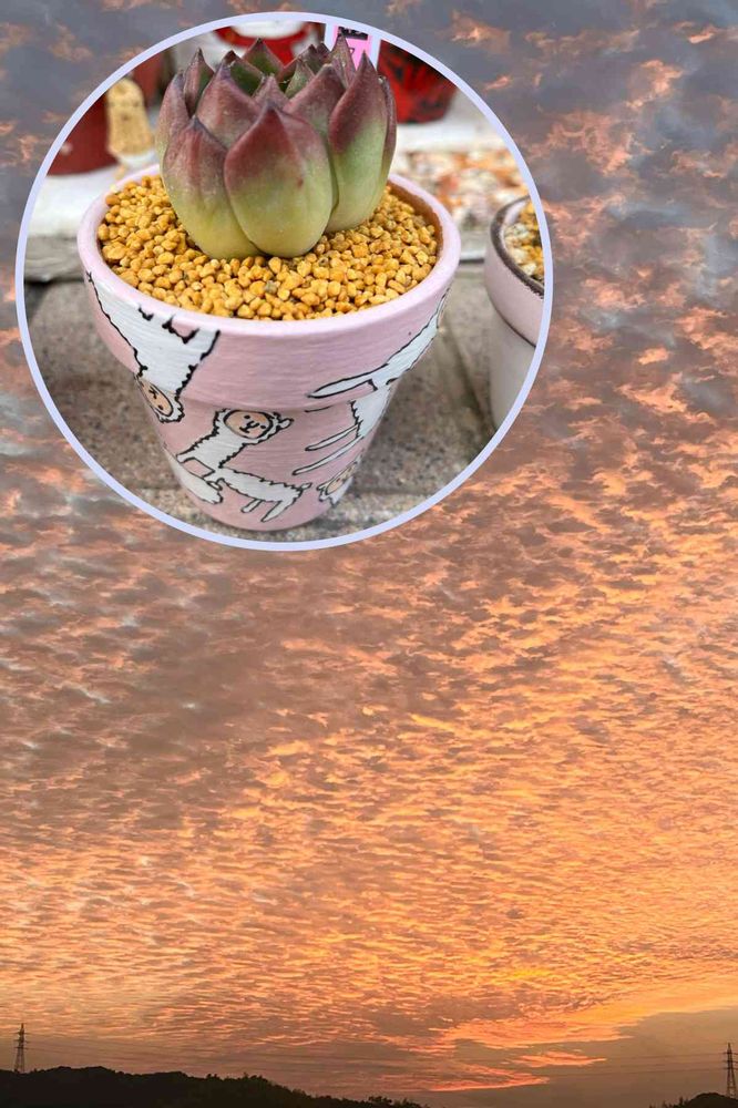 朝焼けなんだね~しみじみ見ちゃうわ〜🐑鉢も多肉もカワ(・∀・)イイ!!💞