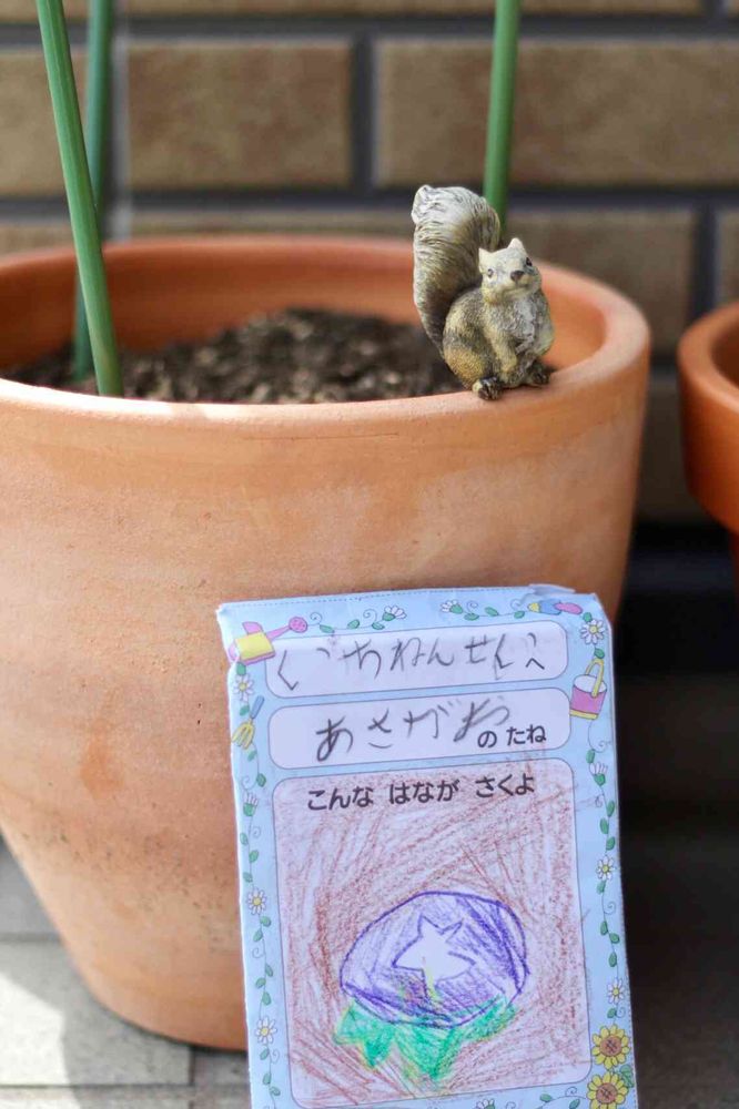 息子が小学校でもらってきたアサガオの種を植えました😊裏には「まいにちみずやりをわすれずにきれいにそだててね」とメッセージがありました☺️