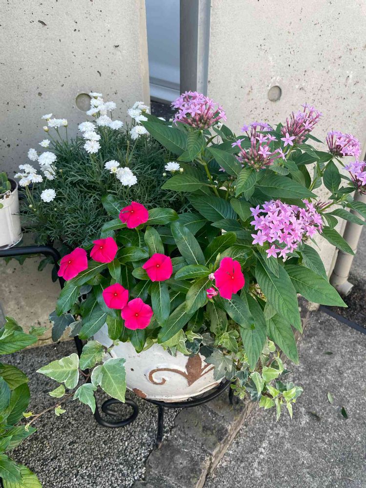 日々草とペンタスを一度切り戻しした寄せ植え。いい感じにまた咲いてます💕