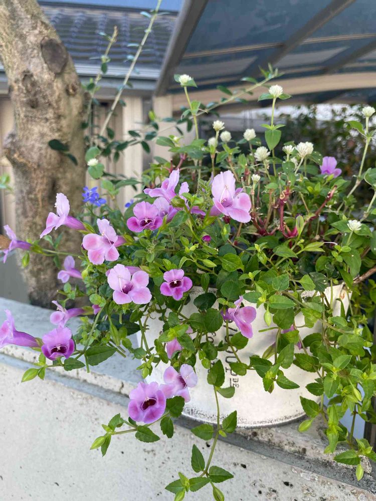 スーパートレニアカタリーナのピンクリバーはブルーと同じように育てていたものの、どうやらウィルス病なのか途中の分岐する辺りで枯れてしまい、大きくならず💦挿し芽っ子も同じような症状になるけど、この寄せ植えした挿し芽っ子だけは元気みたい✨