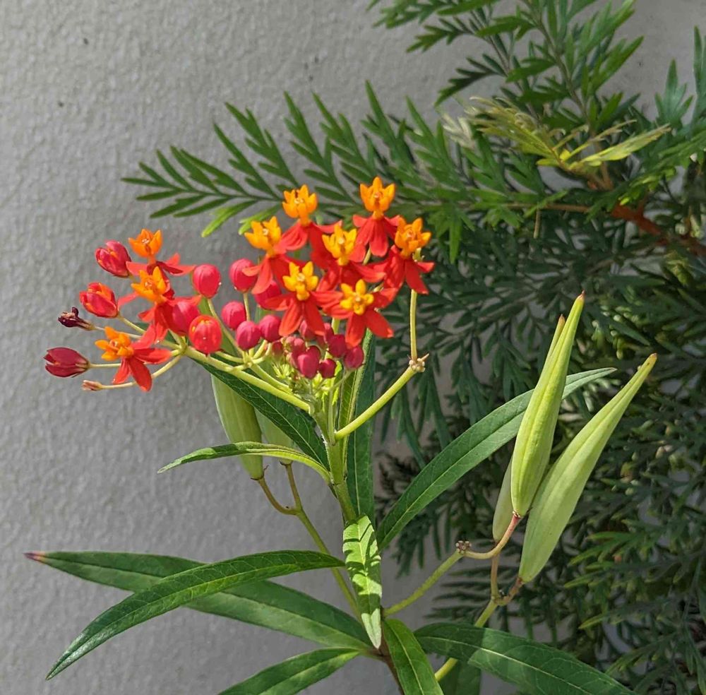 アスクレピアスの朱色と黄色の小さなお花が密に咲いて可愛いですよネ❤💛❤💛❤💛🌿