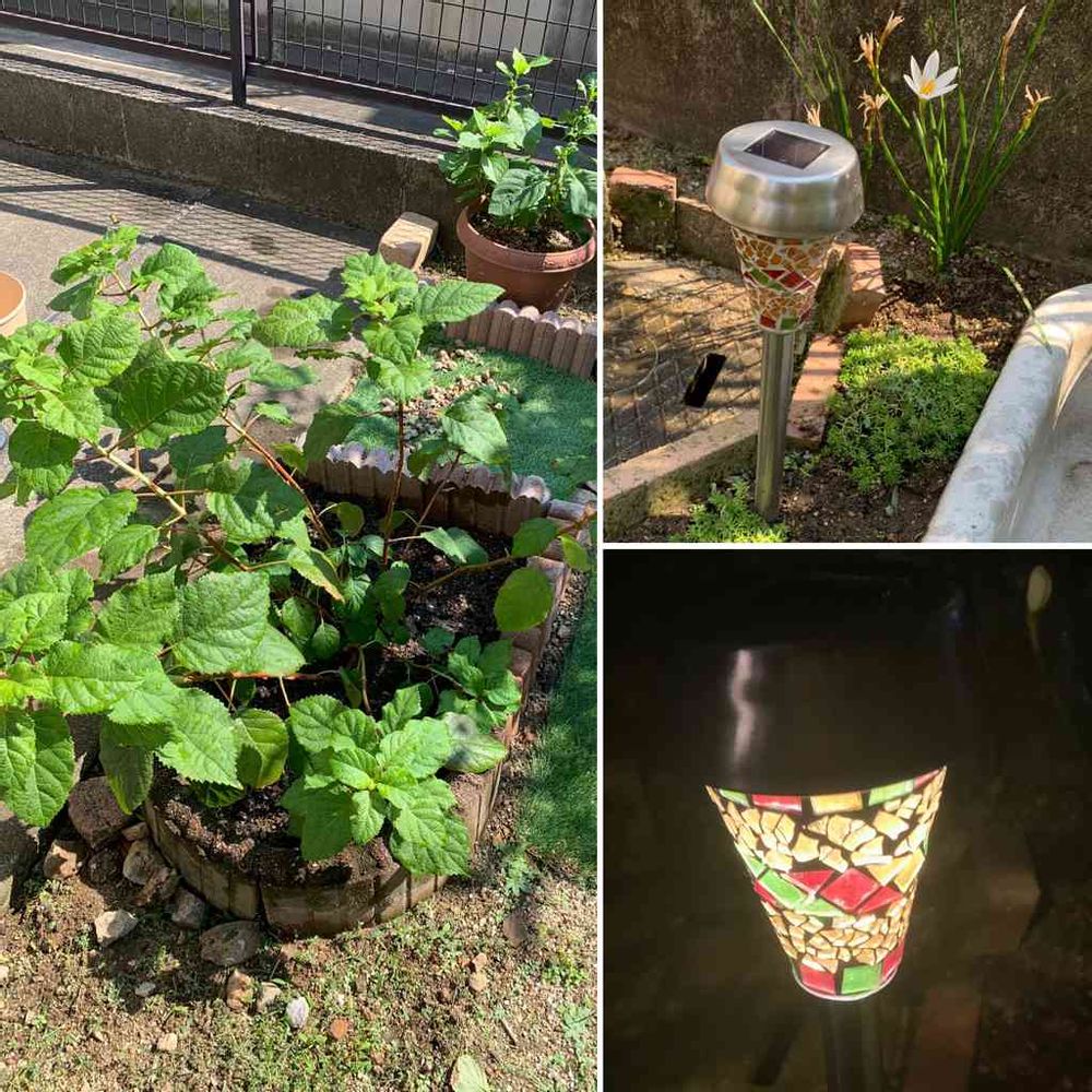 右のはDAISOのソーラーガーデンライト(昼と夜の様子)です。300円商品でしたが、なかなか良いです。