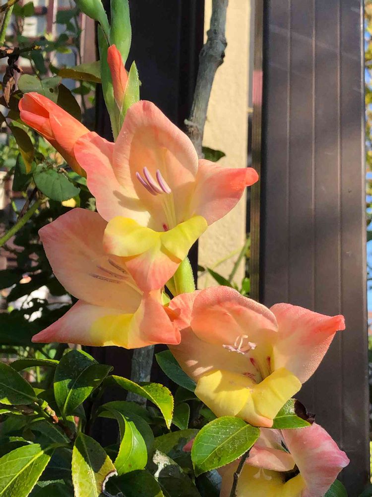 今朝の庭で…花友さんからのグラジオラスが素敵です💛🧡🎶