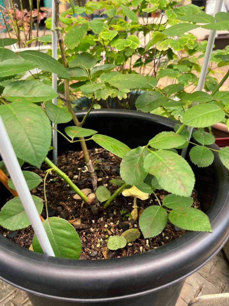 こっちの古株バラちゃんも、1ヶ月くらい前に根元で剪定したら、気持ち悪めなきのこと共生しながら成長してる。