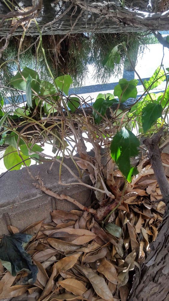 カイヅカイブキの根本に生えているアイビーを裏から撮影