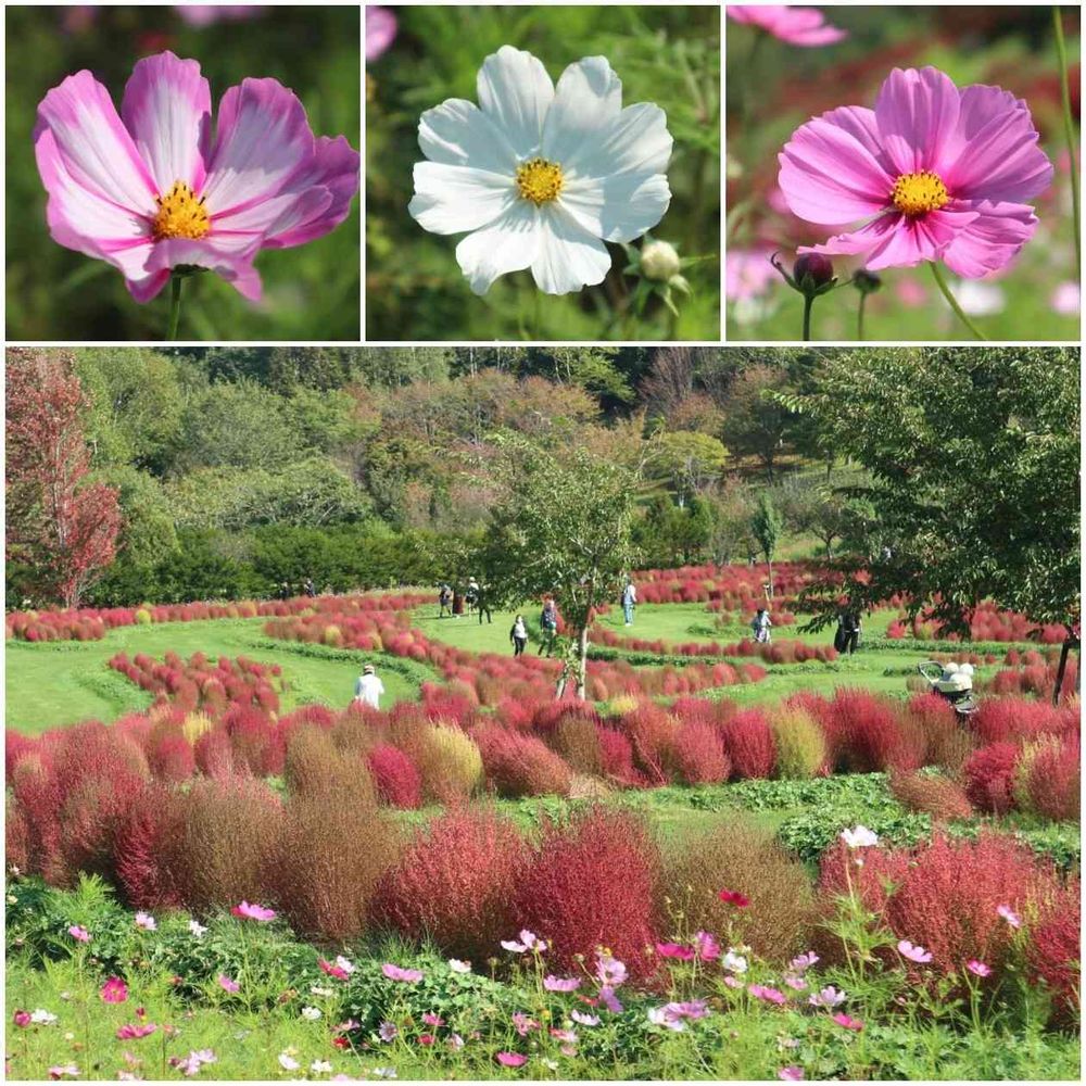 ゆにガーデンのコキア。すでに赤く紅葉していました。コスモスもいっぱい咲いていました☘️