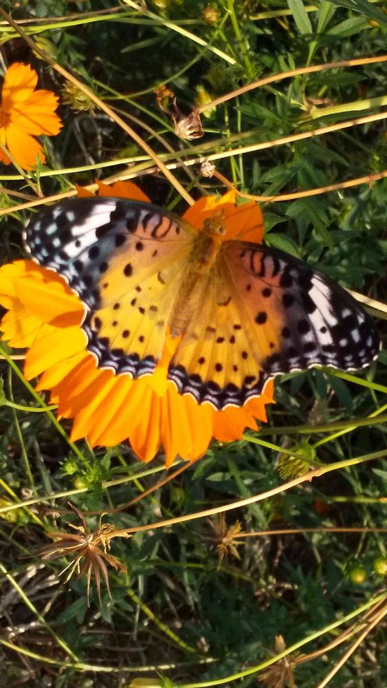 オレンジ色の「キバナコスモス」🏵️に「ツマグロヒョウモン♀」🦋が留まっています。🧡😊😄🤗🌞
