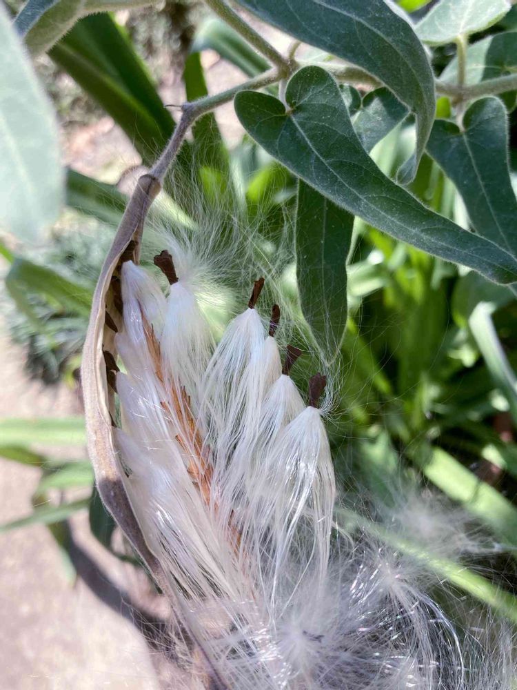 長いことかかって、やっと昨日、ブルースターの鞘が割れました。今日、ふわふわの綿毛をまとって、種がお出ましです。