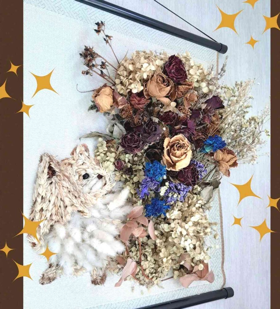 素晴らしい作品ですね、❣️☺️☺️ドライフラワーも綺麗にできるとこのような壁掛けにもなるのですね。ワンちゃんまで可愛く出来てるのびっくりです。すごい技術ですね。おうちの中全体が癒しの空間になったらのでしょうね。(*^o^*)🎶🎵💖💕💚🍀🍀🍀
