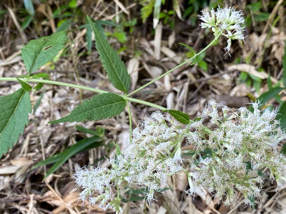 キク目キク科フジバカマ属の多年草です。茎には紫色の斑点や短毛があります。 葉はざらざらして短柄があり、対生に付きます。 白色(稀に淡紫色)の小さな筒状花が多数集まって、散房状に咲かせます。山地の林縁に多く自生します。