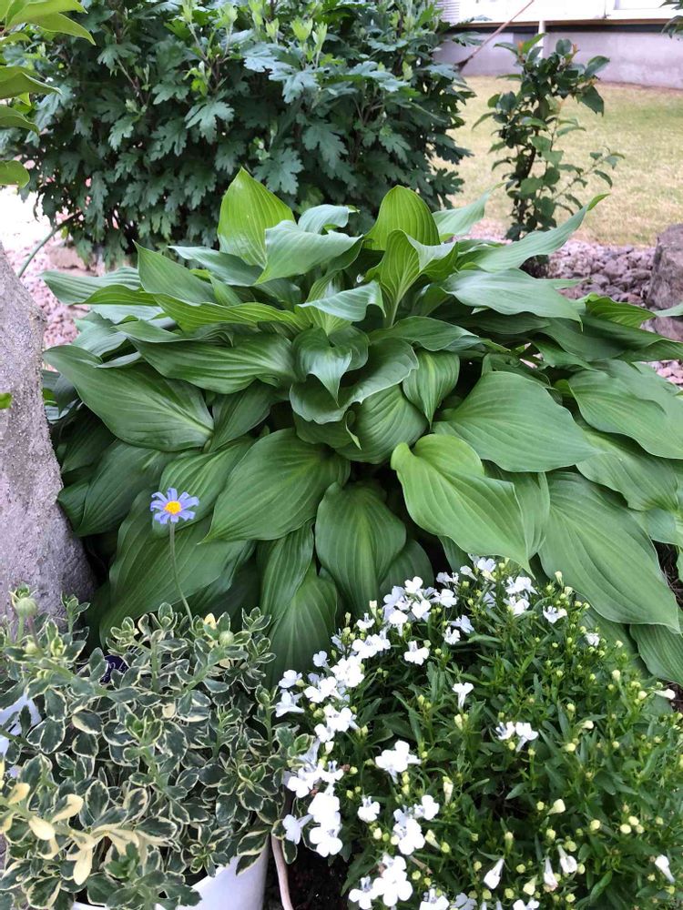 モチノキの株元に先週、我が家に迎えたい「斑入り、ブルーデージー」と右の名前は? 何だったでしょうか?