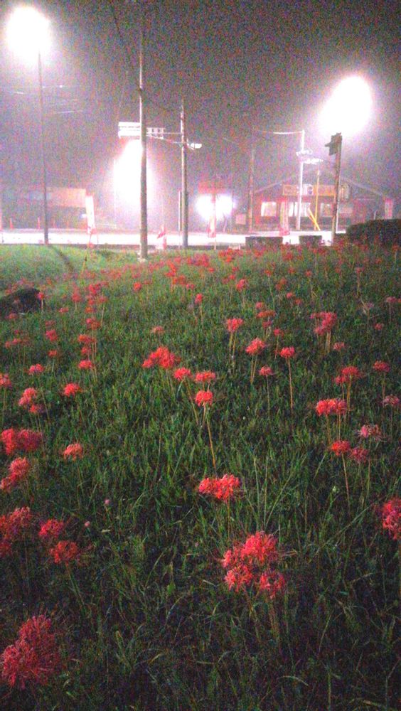今期一番の濃霧、街灯の光が乱反射、彼岸花を浮き立たせてましたo(*⌒―⌒*)oニコッ