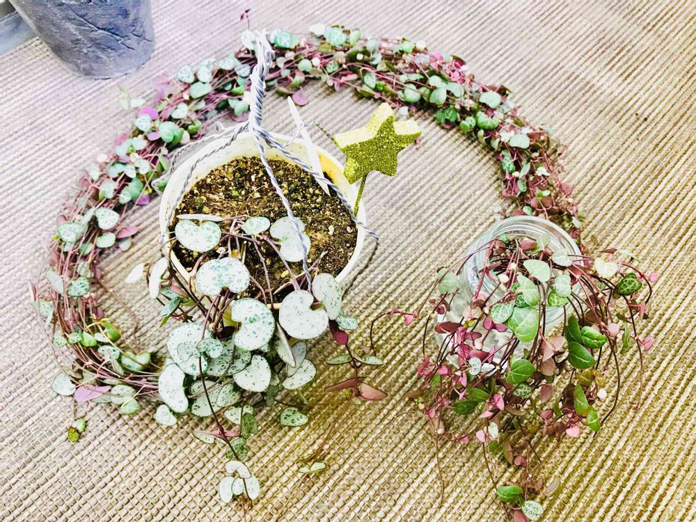 左の鉢のハートカズラは右の瓶の向こう側で途切れてますよ😋
