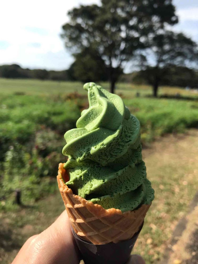 みんなの原っぱの売店でこの公園のシンボルとも言える大ケヤキをモチーフにしたケヤキソフトアイスを食べちゃいました。ショコラコーンに宇治抹茶のソフトクリームです。