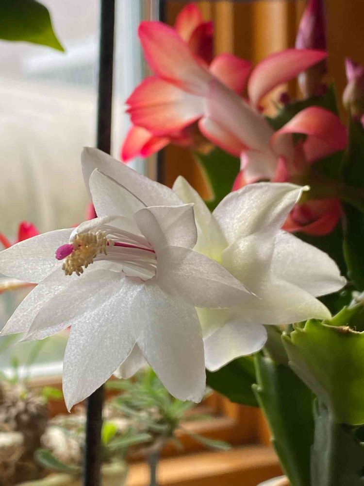 先日スーパーのお花コーナーで見つけたシャコバサボテンの白が咲きました🤍❤️