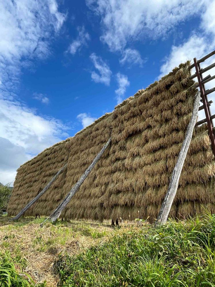 一般的に天日干しをしたお米は「甘み」「旨味」がますと言われています。刈り取った稲をそのまま束にして干し竿で干すので茎からの養分が米に最後まで行きやすく、太陽に干すことによってアミノ酸が増えるといった「考え方」があり旨味が増すと言われています。