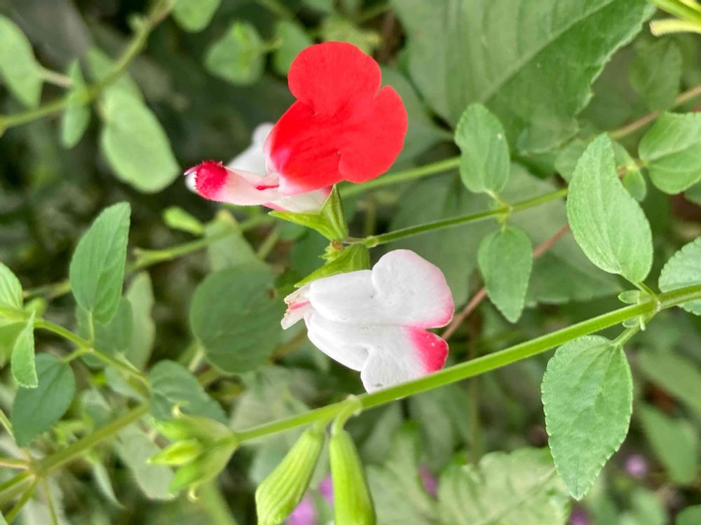 おはようございます😊チェリーセージがポツポツと咲いてます❣️ピンクもいます。近づくとほのかに良い香りがします。ハーブだからかなぁ❓