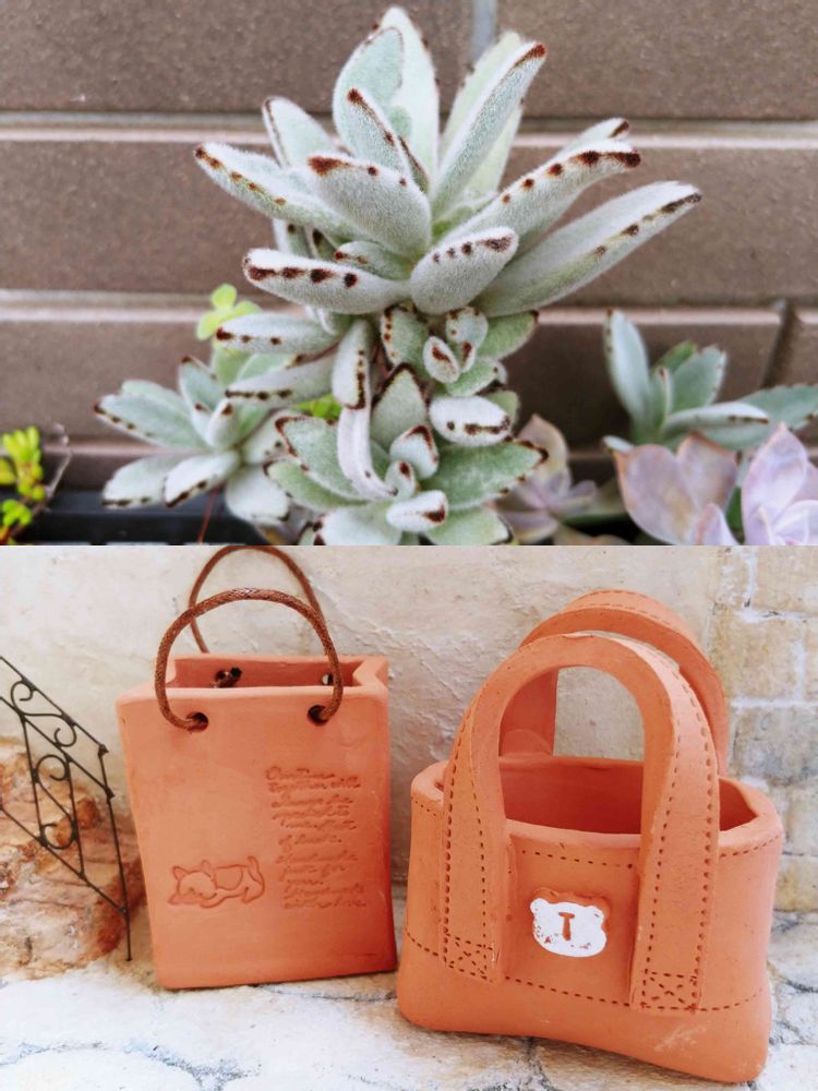 テラコッタ陶芸で作った小さなショップバッグ鉢とトートバッグ鉢。