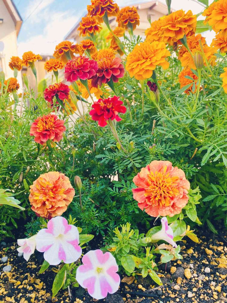 マリーゴールドは花壇のあちこちにタネ撒いたので毎年たくさん咲いてくれます〜🥰それでも今は蛾みたいな蝶々みたいな虫がいっぱい来ますよ😅