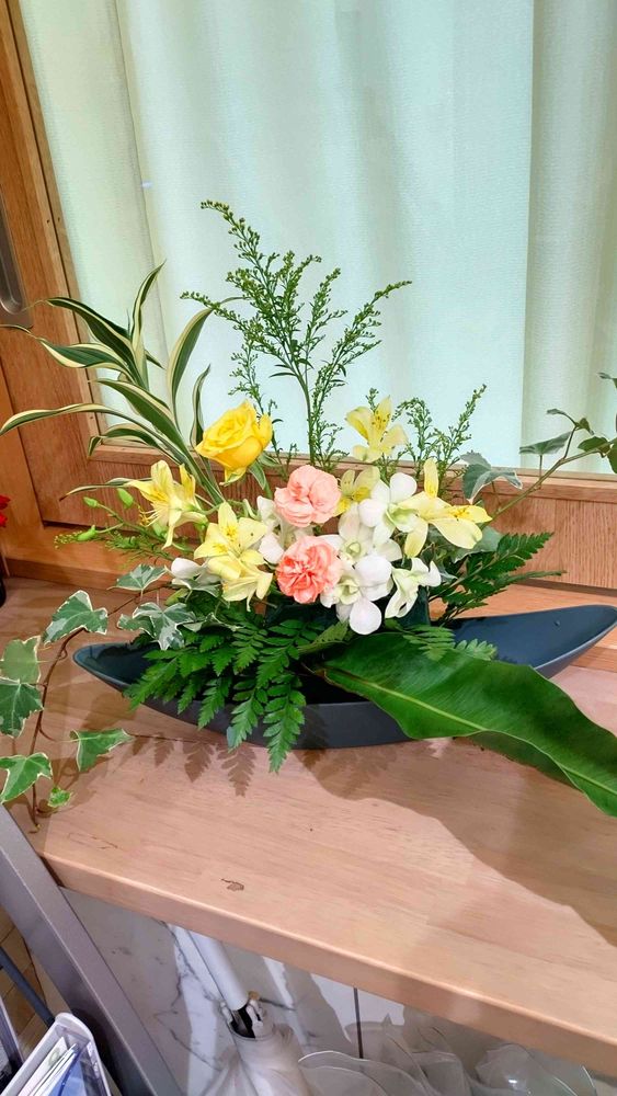 こちらのpicは職場のエントランスに飾ってあったフラワーアレンジメントを生け直ししたもの💕タニワタリをもう1枚使って2段になっていましたが…破棄して1枚にし残り花材でなんとか形にした作品にしました✌️😆✌️