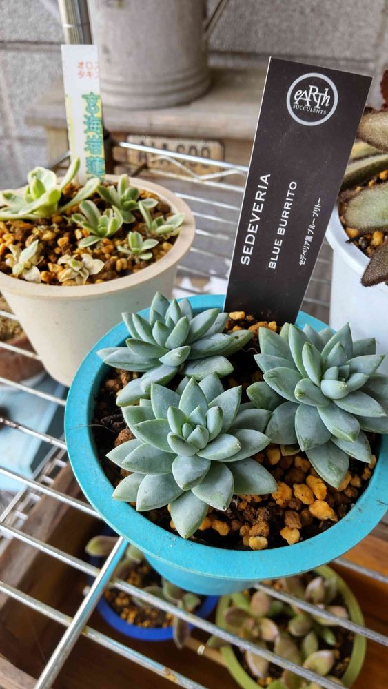 セダム+エケベリアの交配らしい。プックリ葉っぱは成る程👀どことなくブルーに見える🤭🤭🤭