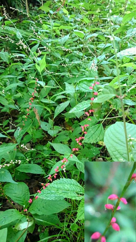 昨日のヤブミョウガのすぐ近くに、白と赤のミズヒキが一緒に生えていました。