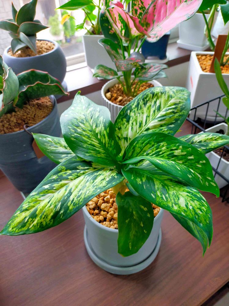 私も似た模様のディフェンバキアを育てていますが、色の名前不明で探していました😅