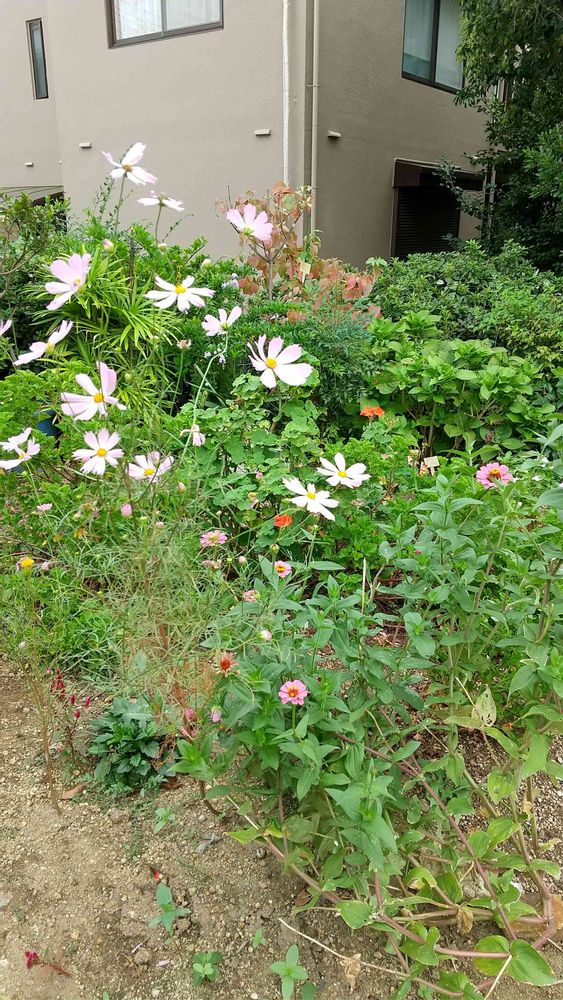 公園の庭に、コスモスの花と百日草の花が綺麗に咲いていました💗