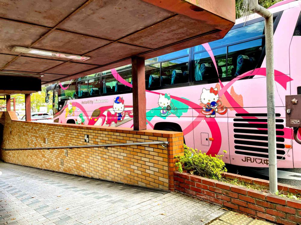 市役所からの帰り道に、駅に向かう歩道で、JRバス🚌がピンク色の可愛い💕キティちゃんバス🚌でした。