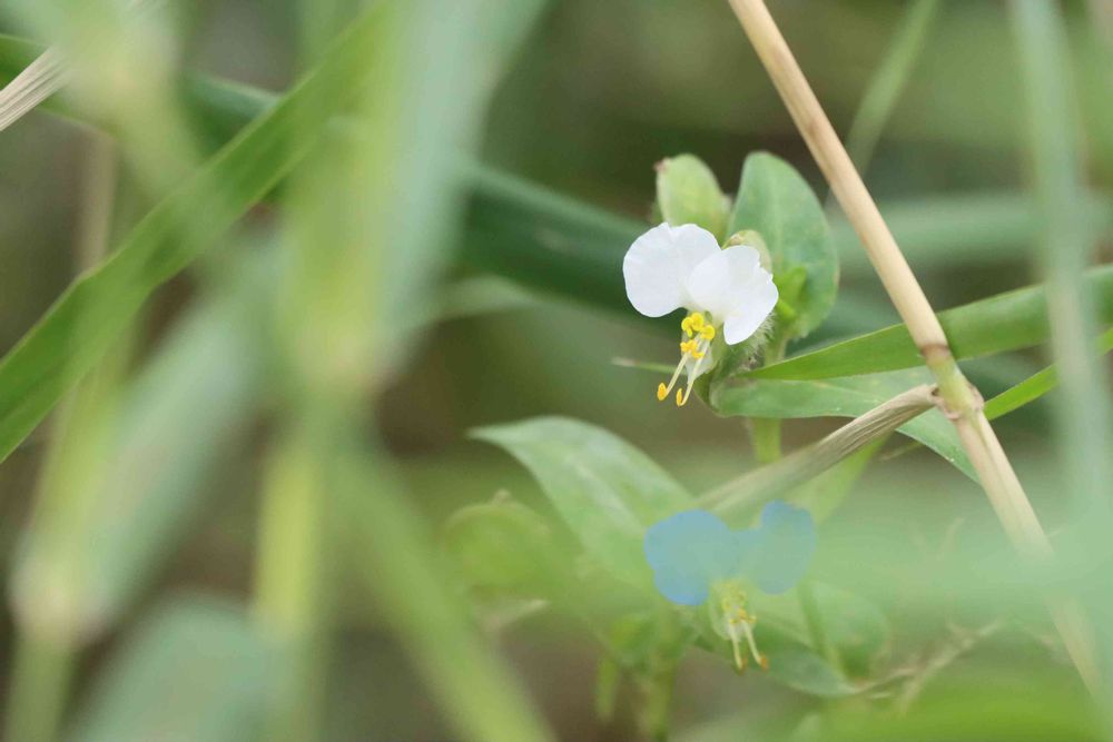 河原で 白花の ツユクサ 見つけました 青花に 混じって咲いていました