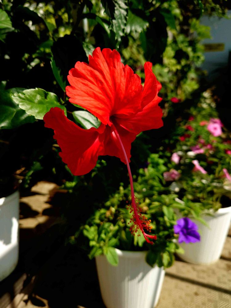 ベランダの「ハイビスカス・イエローフラミンゴ」に又真っ赤なお花が咲きました🌿❤️