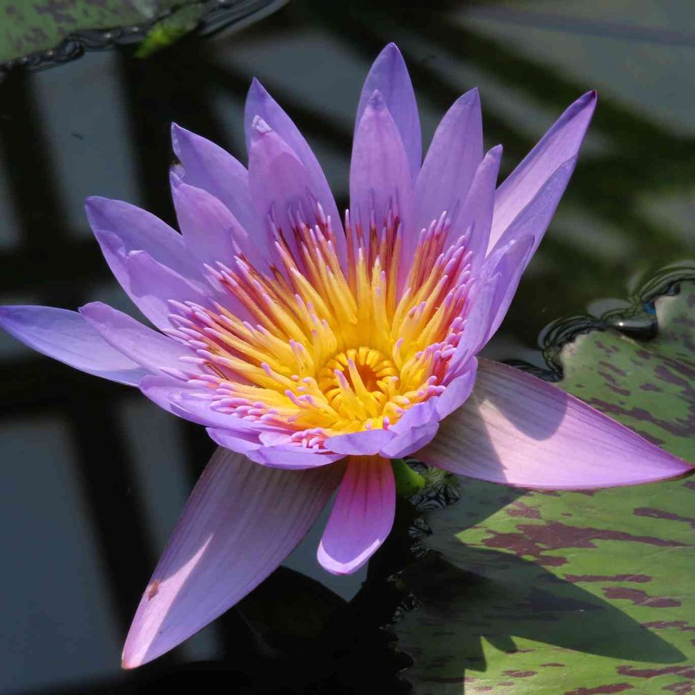 青紫色の品種で、花は栽培環境による変化が激しく、花弁数、花色(淡い、濃い)かなりの幅がある品種🪷、葉には赤茶色の模様が控えめに入ります!