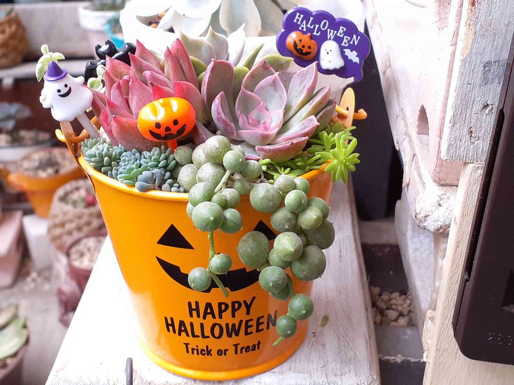 かわいいピンク色の多肉チャンの寄せ植えに🎃ハロウィングッズ👻きゃわいい😍