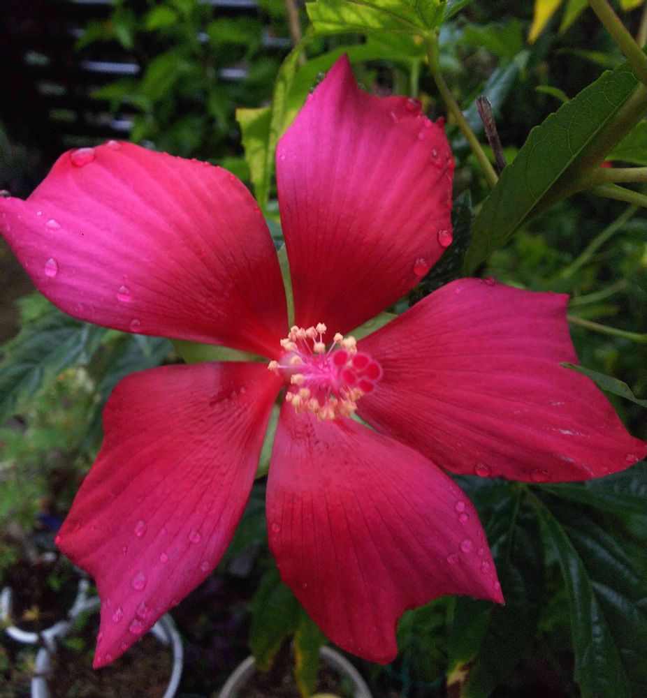 雨が降る中、タイタンビカスが一輪咲いてました(⌒‐⌒)