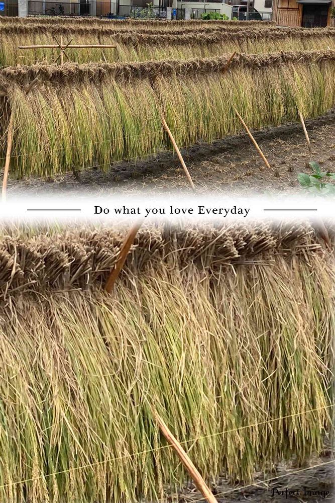 天日干しをしてます。天日(太陽光線)と風によって稲を乾燥させます。1週間程イネを乾燥させ、その後脱穀、揉みすりの作業に入ります。