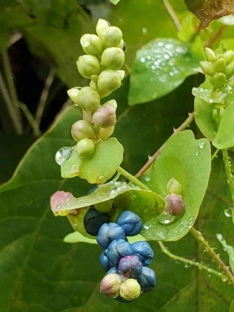 イシミカワという野草です。花はすでに終わってこれは実です(^-^)気まぐれにいろんな色を着けますよ。とても可愛いですが、刺に注意です♬♬♬