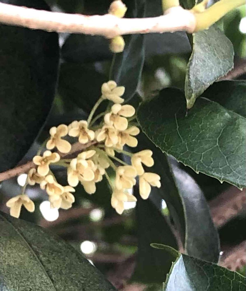 🧐金木犀は、銀木犀の変種だと言われている。銀木犀の花の色:ちょっと黄色がかった白、淡い黄色