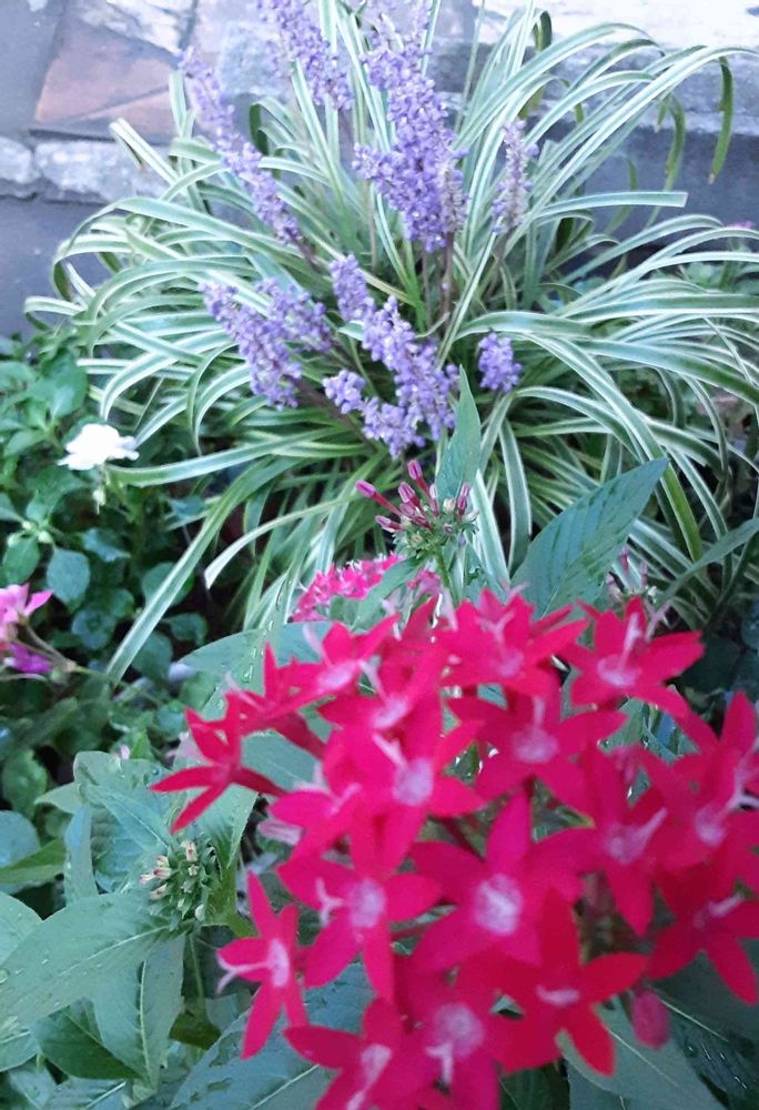 ヤブランと赤いペンタス鮮やかです💖