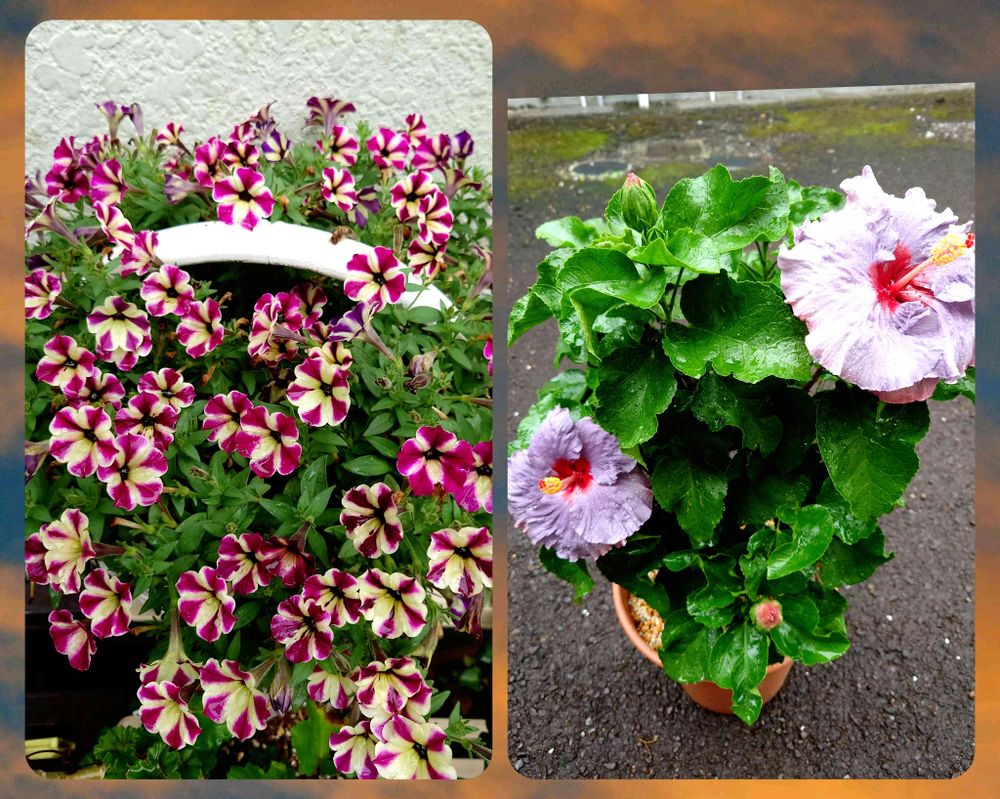 先月半ば過ぎに切り戻したスーパーチュニアと複数咲き始めたハイビスカス🌺デニムブルー