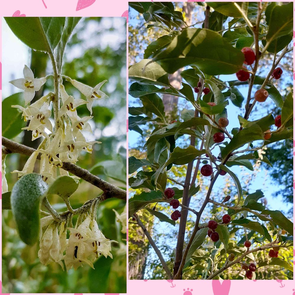 以前、左の白い花の名がわからず🍀モコさん🍀に「グミの花」と教えて頂きました♡ナツグミとアキグミがあり、秋に実がなっていたらアキグミとのこと♡今、赤とオレンジの可愛らしい実がなっています。「アキグミ」の花だったのですね(*^^*ゞ♪