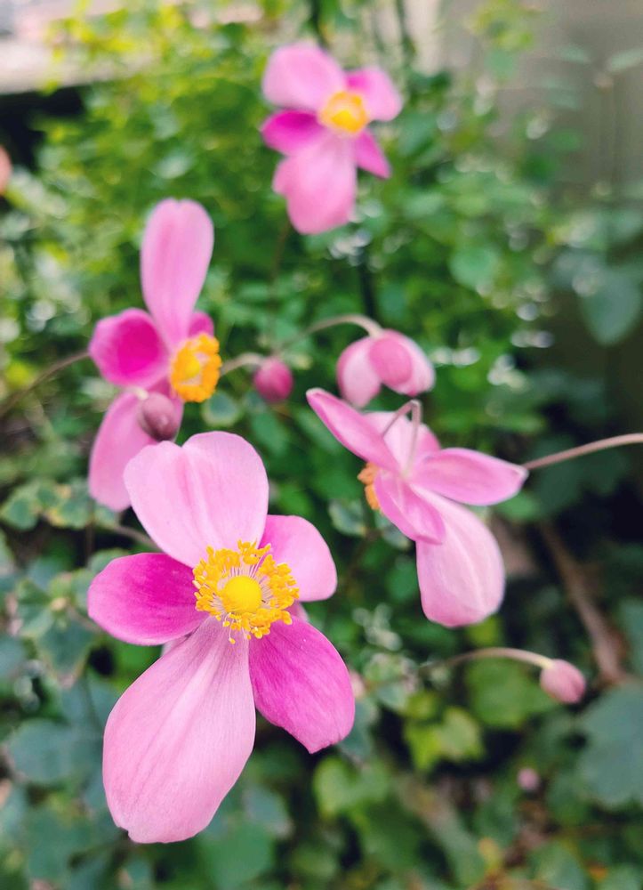 庭のシュウメイギク、あちこちに咲き始めました🌸雨上がりでうなだれてるけど、不規則な形のピンクで可愛く咲いてくれてます☺️