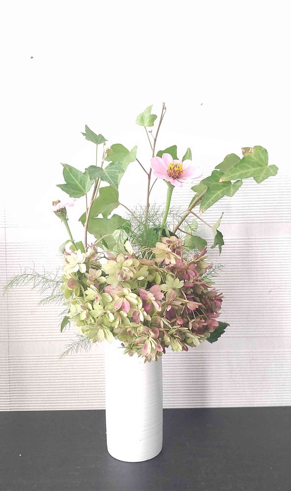 秋色になった紫陽花をヘデラのグリーンとピンク色の百日草と一緒に生けてみました💠🌸🌿💚