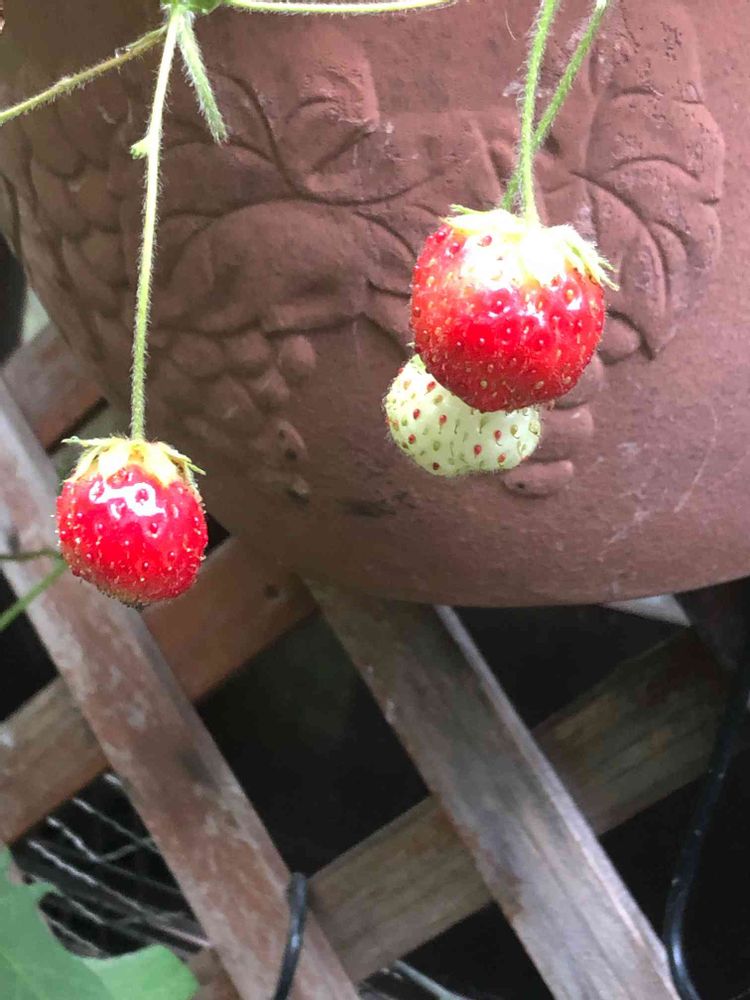 四季なりの紅い花のいちごが、赤くなってきました。✌️目を離した隙に、孫に赤くなっていないものまで取られてしまいました😅