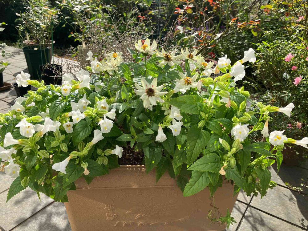 真っ白なジニアとトレニアのお花の組み合わせステキですね〜✨🤍🌿🤍