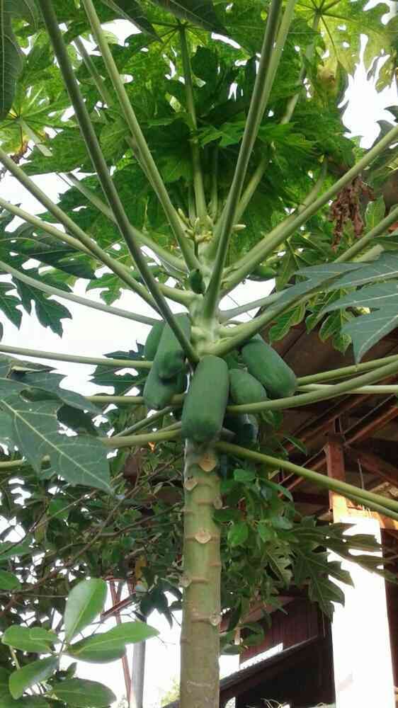 パパイヤのソロ種(雌雄同体種)、普通の雌木とほぼ同様に結実しています。