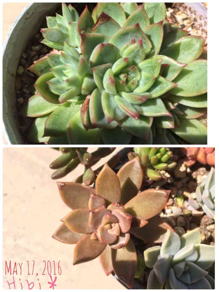先月あたりは中心点が黒っぽくなっていて今はそう酷くなくなったけど、まだ茶色っぽい。ブロンズ姫はあまり葉焼けしにくい強い子だと思っていたけどこの子は育った環境が違うからかなー。なんか葉の形が微妙ーにブロンズ姫と違うような細いよねー。虹の玉と白牡丹と一緒にポット売りしてあったものです。