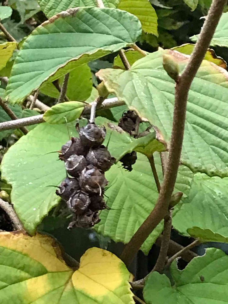 散歩の道沿い。植え込みのトサミズキ。種子を付けています。