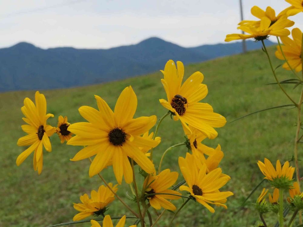 「ヤナギバヒマワリ」(柳葉向日葵)が草原と山々に映えてました✨